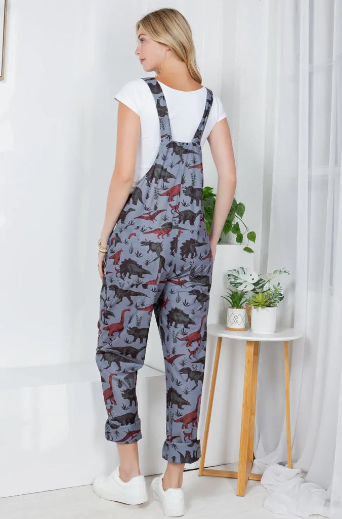 Get ready to roar in these unique dinosaurs print overalls! The playful print will make you stand out and the comfortable fabric will keep you feeling free and funky all day long. Don't be a fossil, rock this look today!