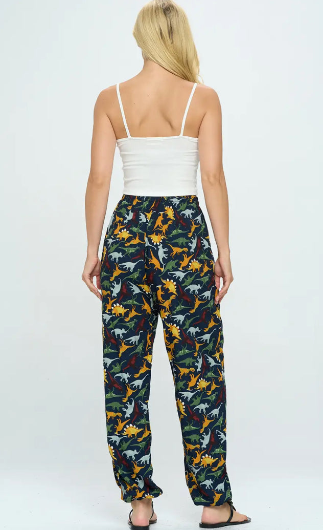 These pants have a fun multi-Dinosaur print. 100% Viscose with an elasticized waist and drawstring! These comfy pants also have deep pockets for you to store your phone while you're on the move!