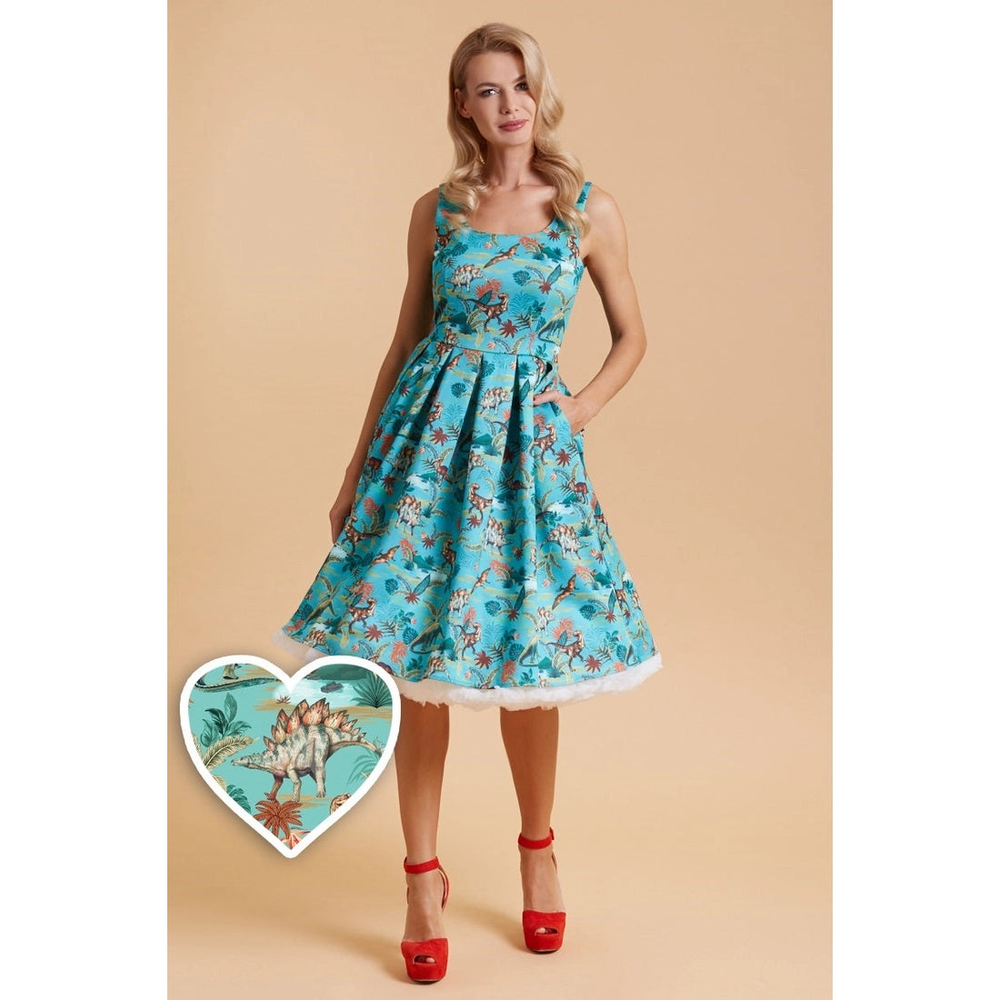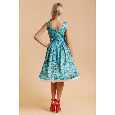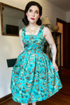 This gorgeous retro-style dress has been cut to compliment your curves! The frock features a lovely flattering fitted bodice, a simple scoop neckline at the front and back, a 50s swinging skirt with box pleats, and a concealed zip at the back.