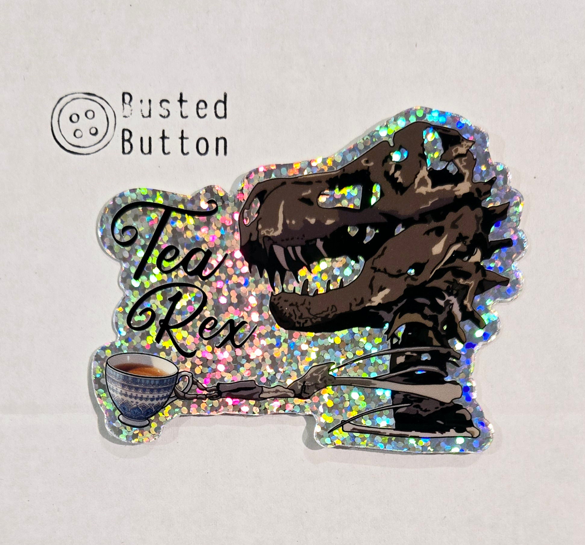 Celebrating the wonderful Tea Party display currently in our museum this locally designed and produced vinyl sticker can stick to laptops, water bottles, or anything else that needs a little sparkle. With a holographic back you can show off your Dino love in the most eye catching way.